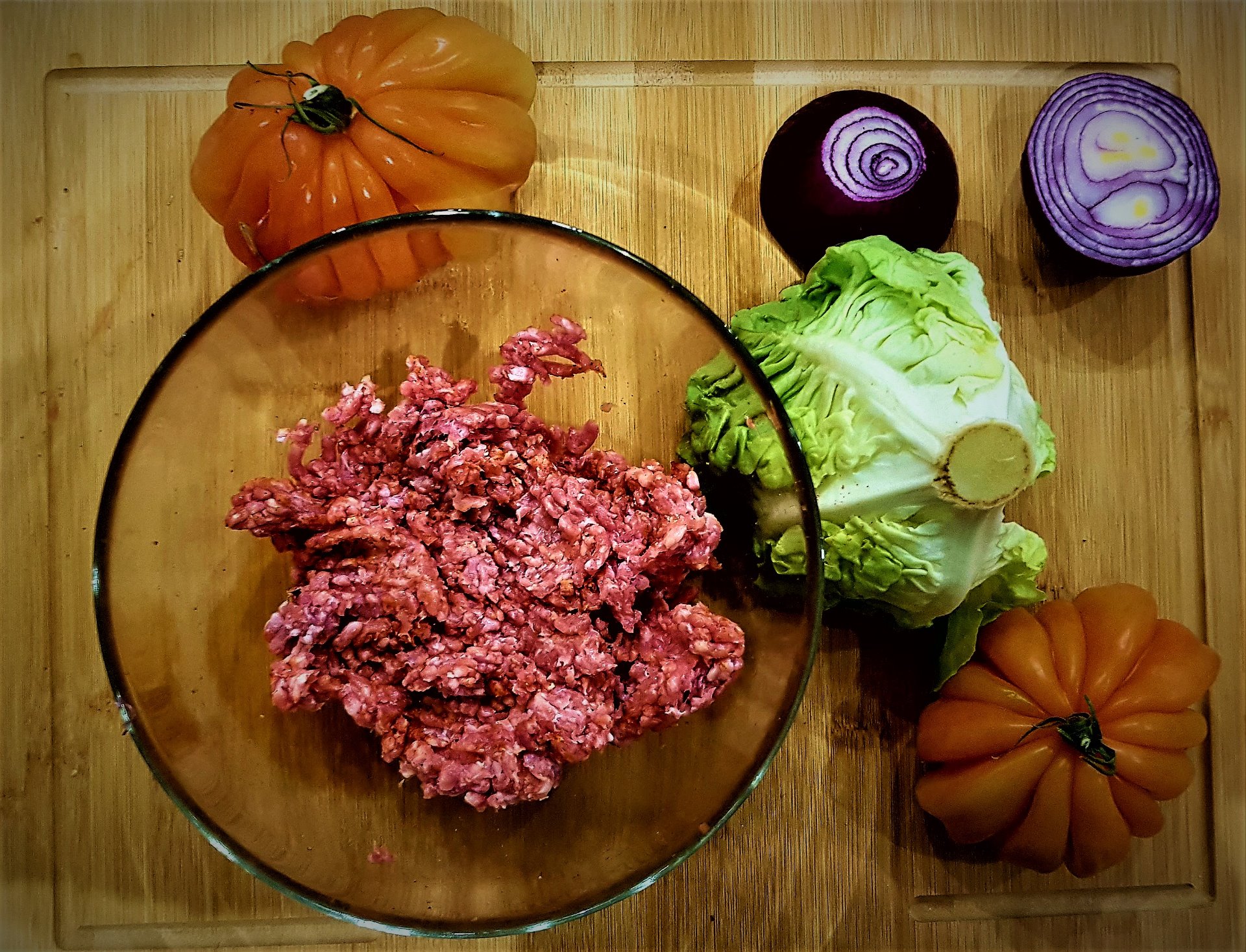 Seguendo l'ordine: una fetta di pomodoro...una fetta di insalata...l'hamburger...una fetta di insalata...qualche anello di cipolla... e infine la fetta di pomodoro a chiusura.